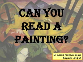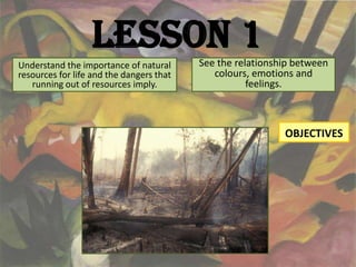 This document outlines lessons from an art class. It covers 5 lessons: 1) understanding the relationship between color, emotion, and feeling by analyzing nature videos and Matisse cutouts; 2) recognizing interdependence in ecosystems by reading the story "Swimmy"; 3) identifying habitat adaptations through the story "The Artist Who Painted a Blue Horse" and creating impossible ecosystems; 4) selecting essential information and techniques by visiting an online art museum; and 5) designing informative cards and a brochure by analyzing real exhibition brochures. The lessons aim to teach students about color, nature, art, and designing exhibits.
