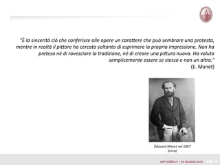 Il documento analizza il periodo impressionista nell'arte, evidenziando la ricerca di una nuova pittura naturalistica da parte di artisti come Monet e Degas. Viene discusso il ruolo di Manet come precursore dell'impressionismo e il contesto delle aste d'arte contemporanee, con un focus sull'andamento del mercato. Infine, vengono presentati i risultati delle recenti vendite all'asta, con opere note che hanno raggiunto elevati prezzi.