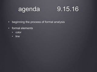 This document provides instructions for conducting a formal analysis of an artwork. It outlines a 4-step process: 1) Experiencing the artwork without preconceptions, 2) Identifying the genre, 3) Identifying the medium, and 4) Considering the dimensions. It then discusses focusing the analysis on specific formal elements like line, color, shape, texture and size. Finally, it provides context on the historical emphasis placed on line and color as the most basic elements of 2-dimensional art.