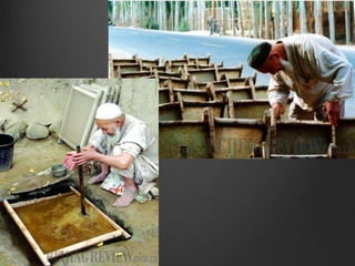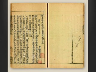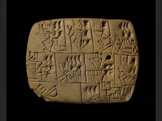 This document discusses the history and evolution of writing systems and print technology from ancient times to the modern era. It describes early writing systems that used clay tablets, papyrus, bamboo, silk, and knotted strings. The rise of paper production in the medieval Islamic world facilitated the spread of books, learning, and new systems of notation. The development of moveable type in the 15th century enabled standardized printing and the mass production of texts. Technological advances in the 19th century like steam power and improved presses led to an explosion in printed materials and the modern publishing industry.
