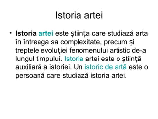 Istoria artei studiază evoluția artei de-a lungul timpului și este considerată o știință auxiliară a istoriei, în timp ce pictura reprezintă realitatea prin imagini bidimensionale cu culori aplicate pe diverse suprafețe. Teoria artei moderne recunoaște pictura ca o formă universală de expresie artistică, în timp ce studiul istoriei muzicii oferă studenților cunoștințe esențiale despre stilurile muzicale. Teatrul implică o echipă creativă și tehnică în producția de spectacole, demonstrând inovații moderne în domeniu.