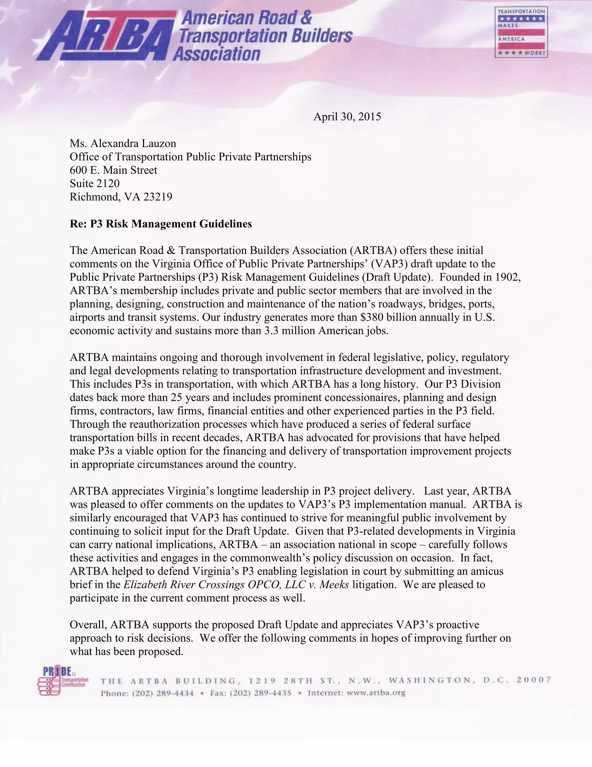 The American Road & Transportation Builders Association (ARTBA) provided comments on the Virginia Office of Public Private Partnerships' draft update to P3 risk management guidelines, supporting the proactive approach while suggesting improvements. Key recommendations include more detailed engagement of project managers in risk assessments, collaboration with private sector stakeholders, and better identification of external risks. ARTBA emphasizes the need for formal risk management training once the guidelines are finalized to ensure consistent implementation across projects.