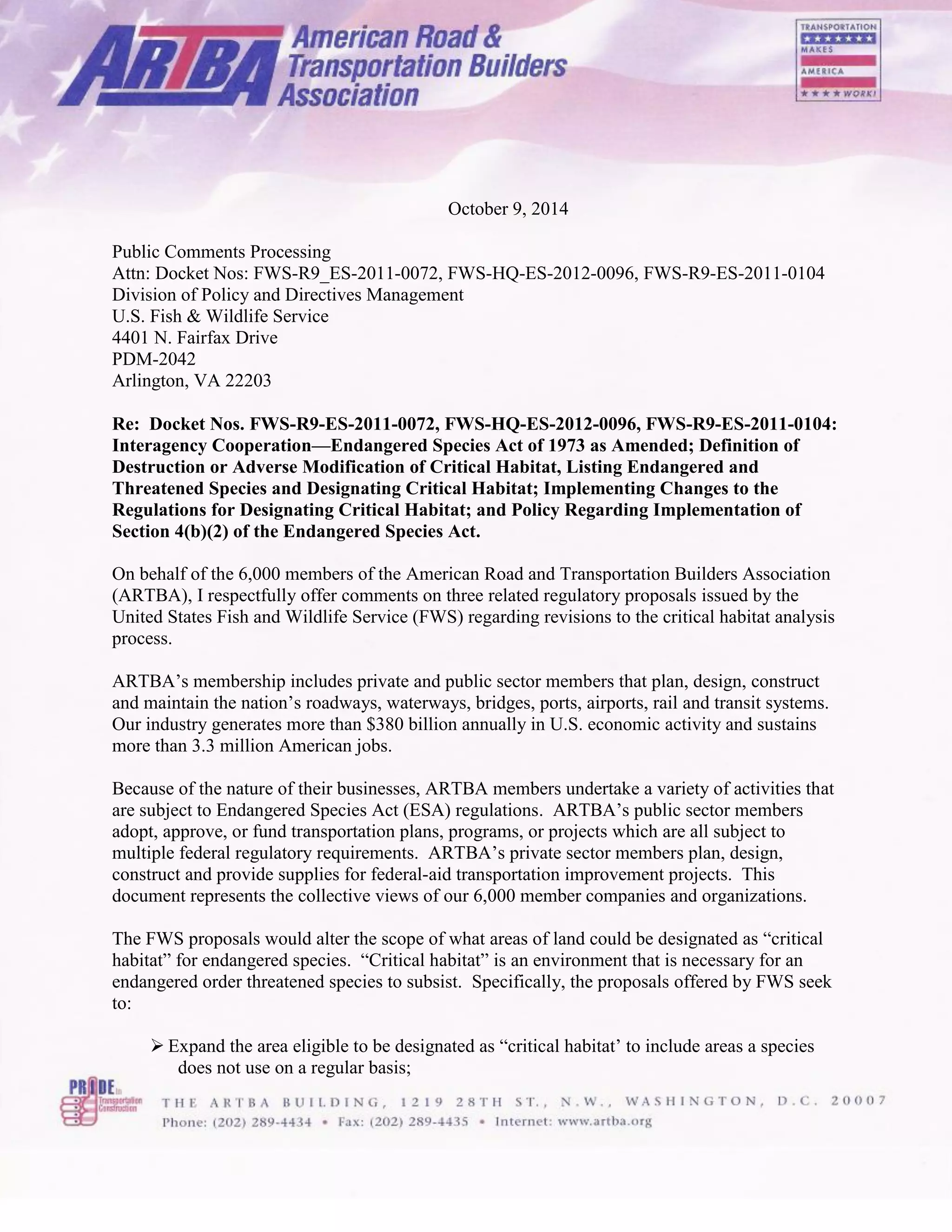 The American Road and Transportation Builders Association (ARTBA) submitted comments opposing proposals by the U.S. Fish and Wildlife Service (FWS) that would expand the definition and scope of "critical habitat" under the Endangered Species Act. ARTBA represents transportation construction industry members that could be negatively impacted by overly broad critical habitat designations. Specifically, ARTBA opposed proposals to designate more areas as critical habitat that species do not regularly use and to regulate more activities performed near critical habitat areas. ARTBA asked FWS to ensure economic analyses supporting critical habitat decisions are transparent, unbiased, and based on the best available data.