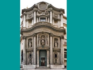 Il documento tratta dell'arte barocca, con particolare riferimento all'architetto Francesco Borromini e all'opera di Guarino Guarini. Borromini, noto per l'uso innovativo delle linee curve e bianche nelle sue opere, ha progettato la chiesa di San Lorenzo alle Quattro Fontane, caratterizzata da una pianta ellittica e dettagli architettonici unici. Guarini, attivo a Torino, è riconosciuto per le sue cupole di originale impostazione, arricchendo ulteriormente lo stile barocco.