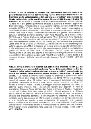 Arte.it è un motore di ricerca italiano dedicato all'arte, creato da Nexta per organizzare efficacemente le informazioni artistiche online. Utilizza un algoritmo avanzato per migliorare la pertinenza dei risultati, consentendo agli utenti di contribuire e correggere informazioni. Il progetto punta a ridurre il 'rumore' di contenuti irrilevanti su internet, con una futura espansione linguistica e funzionalità di ricerca per immagini.
