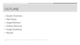The document presents a non-parametric unsupervised approach for content-based image retrieval and clustering. It uses spectral clustering to group images retrieved from Flickr based on keyword searches. The method removes outlier images from the initial retrieval set and clusters the remaining visually similar images without using metadata or tags. It was tested on queries for 3 cultural heritage sites and was able to cleanly cluster hundreds of images for each site with no prior dataset knowledge.