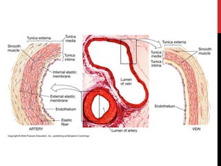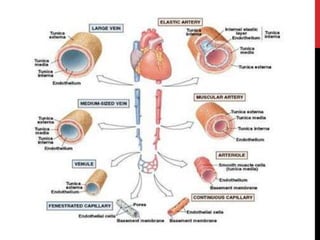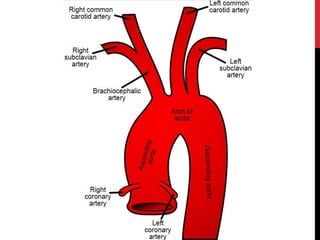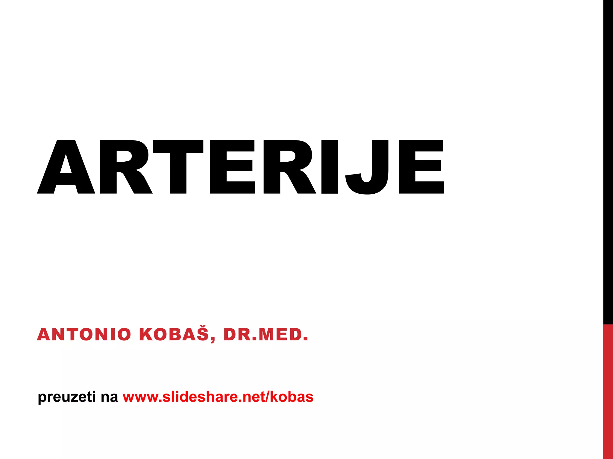 Dokument opisuje građa i podjela arterija, uključujući tri glavna sloja i njihovu funkciju u regulaciji krvnog protoka. Aorta, kao najveća arterija, opskrbljuje krv različitim dijelovima tijela kroz brojne grane. Također se navode specifične arterije kao što su zajednička arterija glave i bubrežne arterije, te njihova opskrba različitim organima.