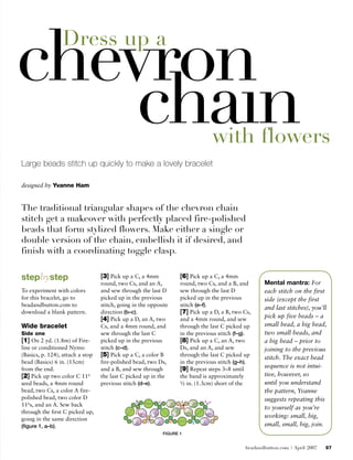 This document provides instructions for making a chevron bracelet embellished with fire-polished beads arranged in floral motifs. The summary includes instructions to make either a wide or narrow version of the bracelet using different bead combinations and colors. Embellishments are added by sewing additional beads in a picot edging or chevron pattern around the bracelet.
