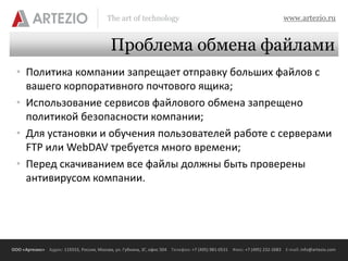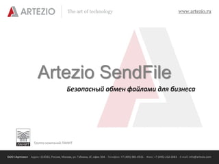 Документ описывает сервис SendFile от компании Артезио, который обеспечивает безопасный обмен большими файлами для бизнеса, соблюдая политику безопасности. Сервис интегрирован с Active Directory и предлагает простой интерфейс, позволяющий пользователям мгновенно отправлять и запрашивать файлы. Он также учитывает историю обмена и позволяет контролировать доступ и лимиты скачиваний.