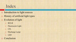 The document discusses the history and evolution of artificial light sources from their inception to modern times. It begins by distinguishing natural light sources like sunlight from artificial ones invented by humans. The first artificial light source was the incandescent light bulb invented by Thomas Edison in 1879, which used a heated filament to produce light but was inefficient. Fluorescent lights were developed later and were more efficient. Compact fluorescent lights and various discharge lamps further increased efficiency. Recently, LED lights have become most efficient due to lower energy consumption and longer lifespan than other alternatives. The document traces the technological progression of artificial lighting over time to become more sustainable.