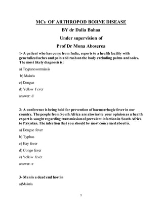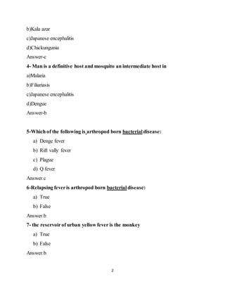 This document contains 31 multiple choice questions about arthropod-borne diseases. The questions cover topics like the symptoms and diagnosis of yellow fever, the transmission cycles and hosts of diseases like malaria, dengue, and Japanese encephalitis. Public health interventions for diseases such as plague and typhus are also addressed, including vaccination schedules and treatment options. Arthropod vectors and their roles in transmission are discussed for various diseases.