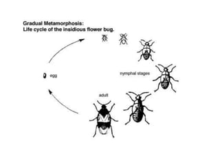 Arthropods are the most diverse and abundant group of animals. They make up over 80% of all known animal species. Arthropods are found in nearly all habitats on Earth and have been highly successful in adapting to life on land, in water, and air. They have a segmented body, jointed appendages, a hard exoskeleton that is periodically molted, and bilateral symmetry. Insects are the largest class of arthropods, making up over 50% of all known animal life. Insects go through complete or incomplete metamorphosis from egg to adult. Their body segments are specialized for different functions and they have an exoskeleton, jointed legs, and often wings.