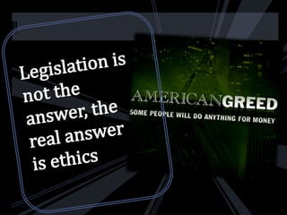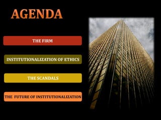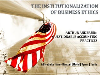 Arthur Andersen was once a leading accounting firm that set standards for the profession but faced scandals due to questionable accounting practices that compromised its independence and integrity. Its culture prioritized revenue growth over ethics. It provided both auditing and consulting to Enron, violating standards by issuing unqualified statements despite improper accounting that falsified financial disclosures. After Enron's fraud was revealed and documents destroyed, Arthur Andersen was found guilty of obstruction of justice and ceased operations. The scandals led to new regulations like the Sarbanes-Oxley Act to strengthen financial disclosures and auditor independence but critics argue it does not prevent all excessive risk taking.