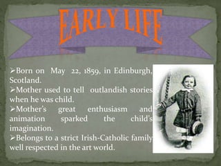 Sir Arthur Conan Doyle was born on May 22, 1859, in Edinburgh, Scotland, and is best known for creating the iconic character Sherlock Holmes. He published his first work, 'A Study in Scarlet,' in 1886, and despite his death on July 7, 1930, his literary legacy endures, particularly with Holmes remaining a celebrated figure in fiction. Doyle was also a man of various interests, including sports and philanthropy, earning numerous accolades throughout his life.