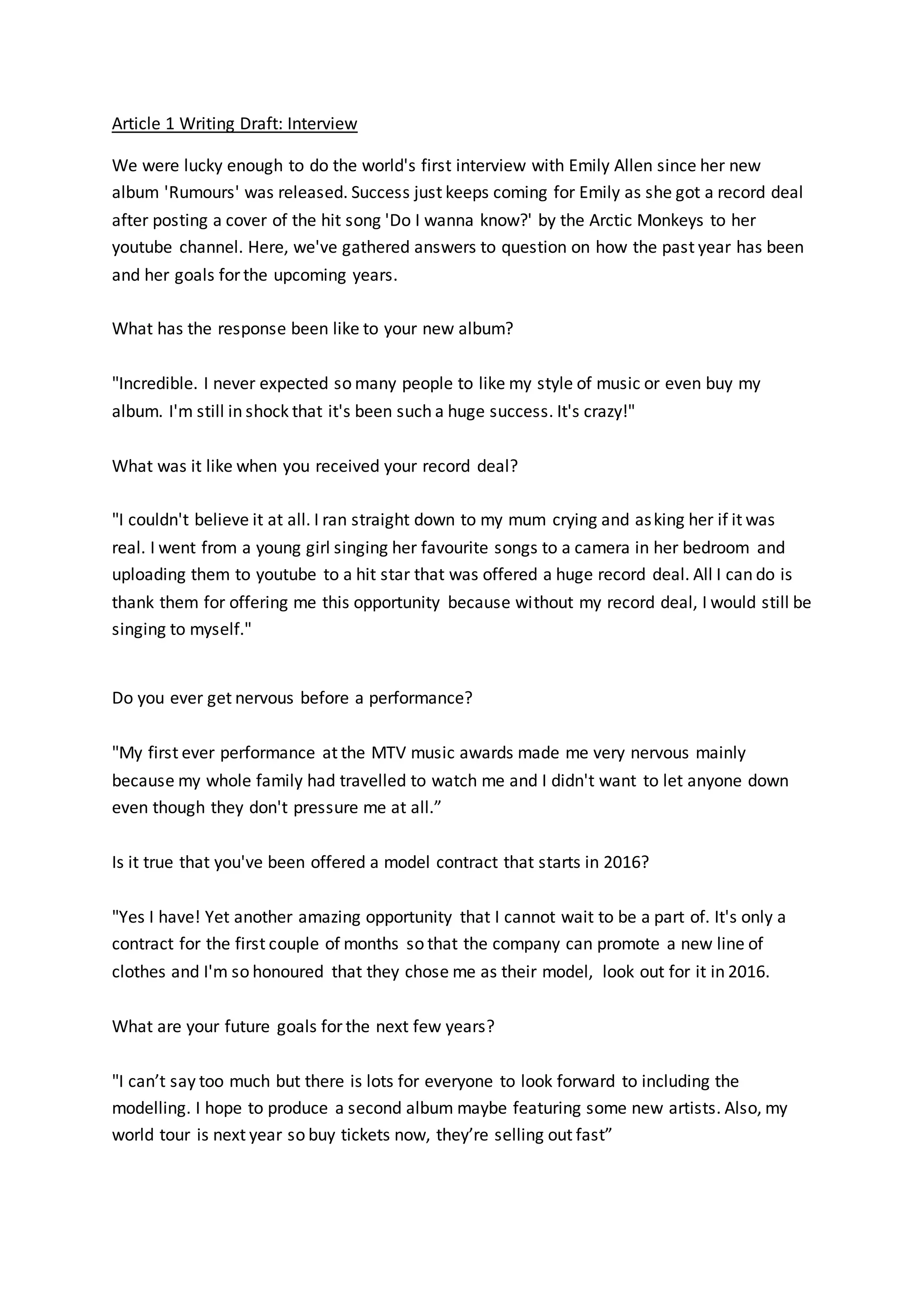 Emily Allen's new album 'Rumours' has been a huge success. She got her record deal after posting a cover of an Arctic Monkeys song to YouTube. In an interview, she expressed shock at the positive response to her album and getting a record deal from a YouTube video. She was offered a modeling contract and is working on a second album and world tour for the next few years.