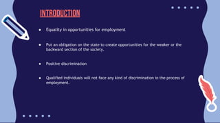 - Clause 4 allows for reservation of jobs and appointments for backward classes and scheduled castes/scheduled tribes to promote their social and economic well-being. Several court cases have examined and upheld these reservations.