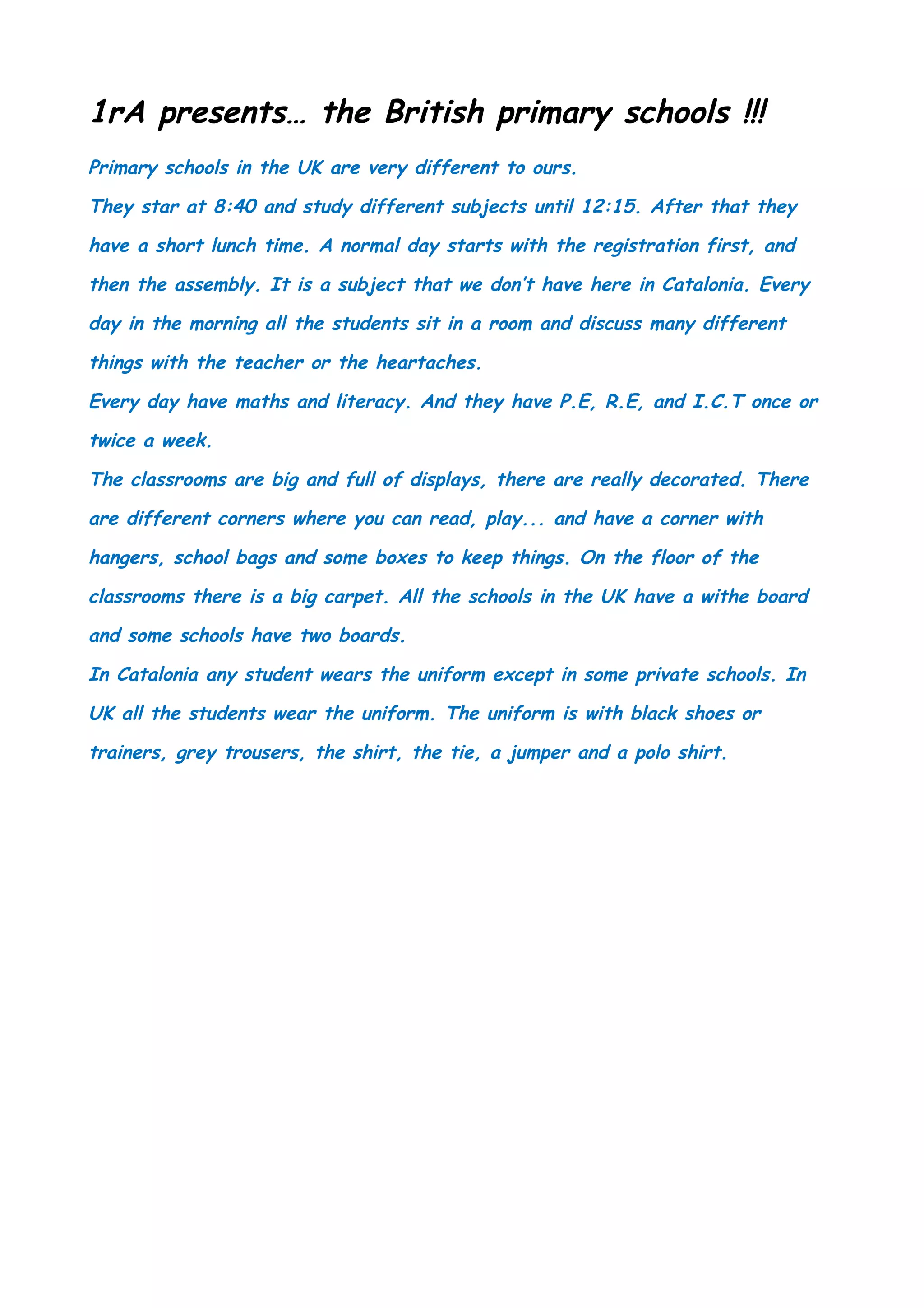 Primary schools in the UK start later than in Catalonia, at 8:40am, and have subjects until 12:15pm followed by a short lunch break. A typical day includes registration, assembly, math, literacy, and other subjects like PE, RE, and ICT one or two times a week. Classrooms are large and decorated with displays, reading corners, and storage areas. All students in the UK wear school uniforms consisting of black shoes, grey trousers, a shirt, tie, jumper, and polo shirt, unlike in Catalonia where uniforms are less common.