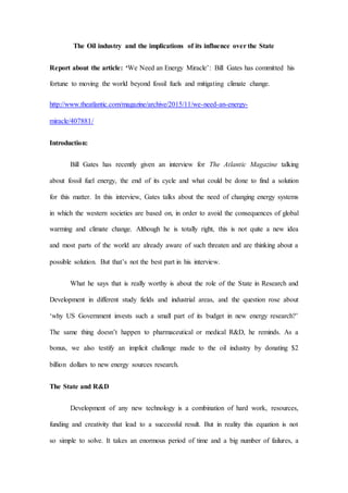 - It analyzes the close relationship between governments, especially the US, and the oil industry, noting lobbying against alternative fuels and how reliant some states are on oil exporters, suggesting this hinders investment and progress on new energy sources.