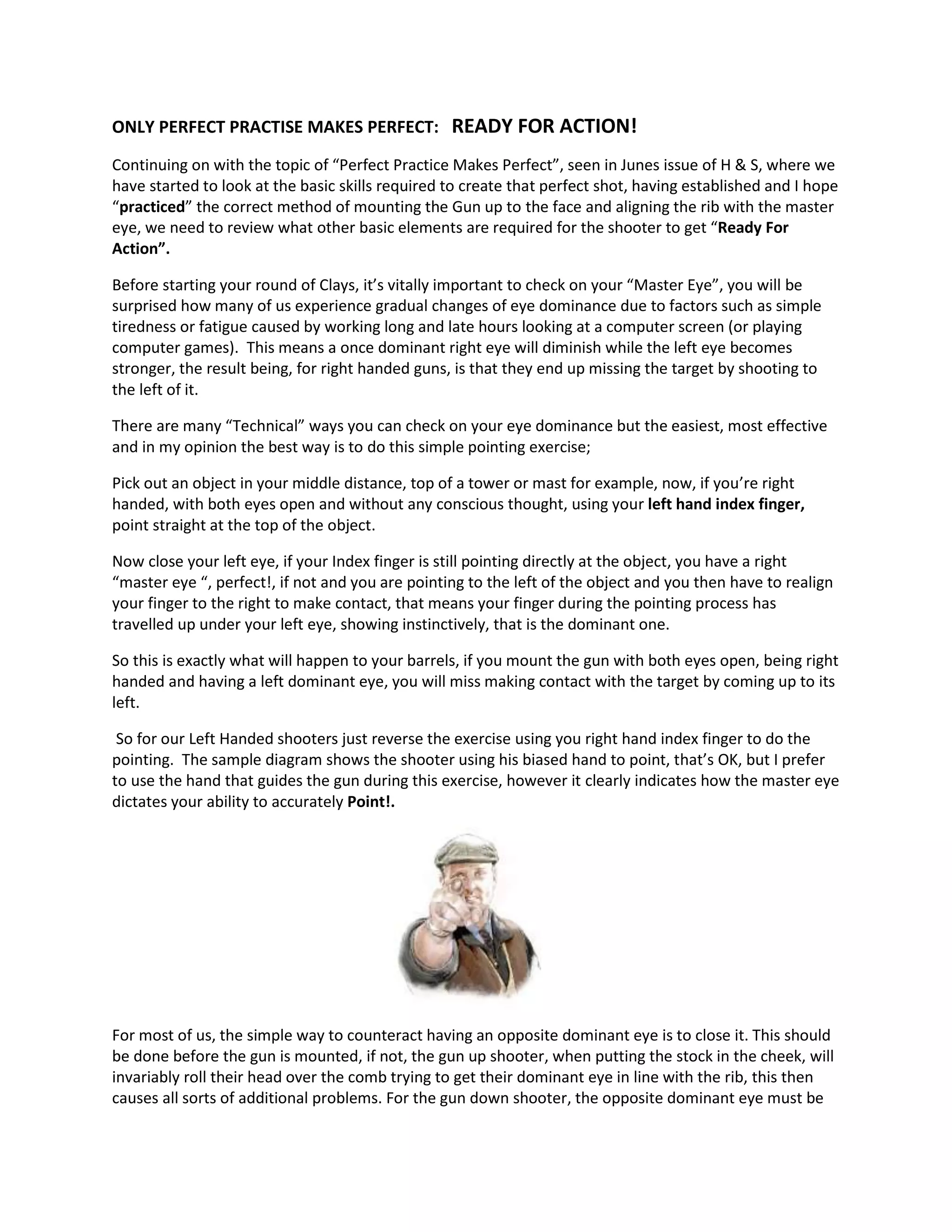 1) Eye dominance can change over time and should be checked regularly, as shooting with the non-dominant eye can cause missed shots. The author provides a simple test to determine eye dominance.