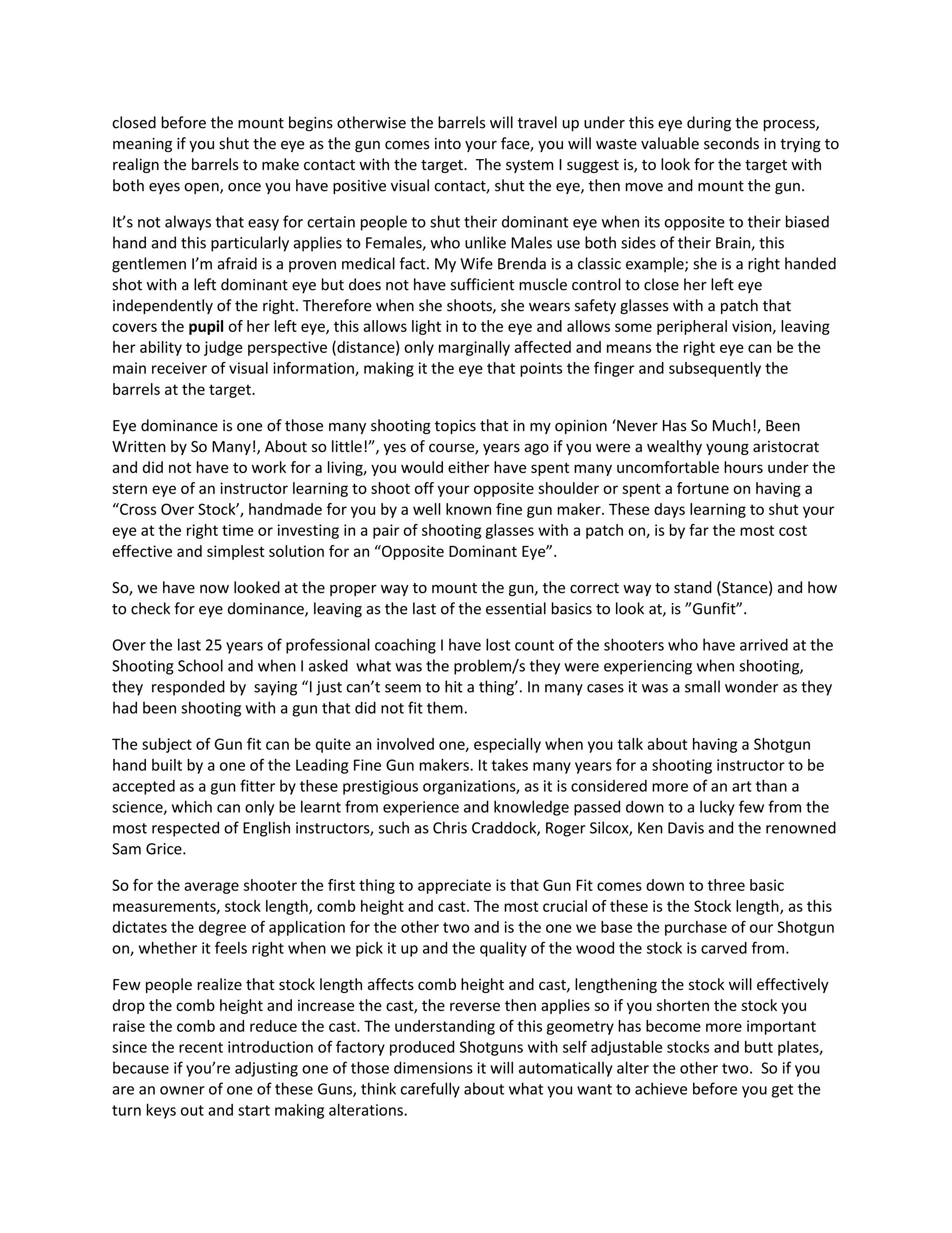 This document discusses the importance of proper gun fit and eye dominance for shooting. It outlines several key points: