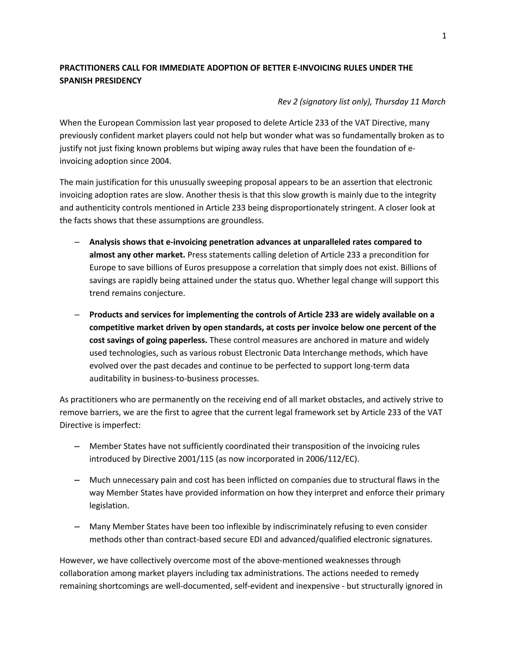 Practitioners in the e-invoicing industry call on the Spanish Presidency and EU Member States to immediately adopt improved rules for electronic invoicing under Article 233 of the VAT Directive. They argue that removing references to specific control measures for integrity and authenticity would reduce legal certainty and market confidence. An obvious compromise is to require integrity and authenticity be demonstrable within a reasonable time, allow any means to achieve this, and maintain reference to established methods like EDI and e-signatures that Member States accept. Failure to resolve issues further reduces market confidence in the EU's commitment to e-invoicing.