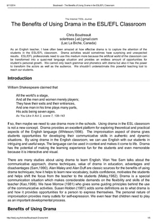 Drama has many benefits for teaching English as a second language. It allows students to practice their communication skills in authentic situations. Role playing builds students' confidence and shifts the focus from the teacher to student-centered learning. Drama makes learning fun and memorable by bringing English to life through interactive activities. It helps students develop skills like cooperation, creative thinking, and social awareness that are useful for school and life.