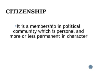 The document discusses citizenship and defines it as membership in a political community that involves duties of allegiance and protection. It outlines how citizenship can be acquired through jus sanguinis (citizenship by blood), jus solis (citizenship by place of birth), and naturalization. The key ways to become a Filipino citizen are by birth to a Filipino parent, especially for those born to Filipino mothers before 1973, or through the naturalization process which has requirements for age, residence, character, language ability, property ownership, and education of children.