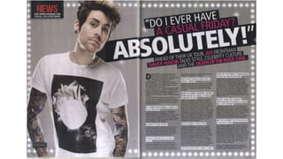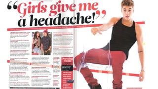 This document provides an analysis of an article/Q&A with Justin Bieber. It summarizes key design elements like a large, eye-catching quote at the top in pink and black font matching Bieber's casual photo. Questions are bold and colored to match the heading, with answers in normal font. A photo relates to the interview topic and promotions advertise Bieber's radio appearance and single. Overall the layout is well-spaced across double pages with the artist photo off-center and color-coding for visual interest.