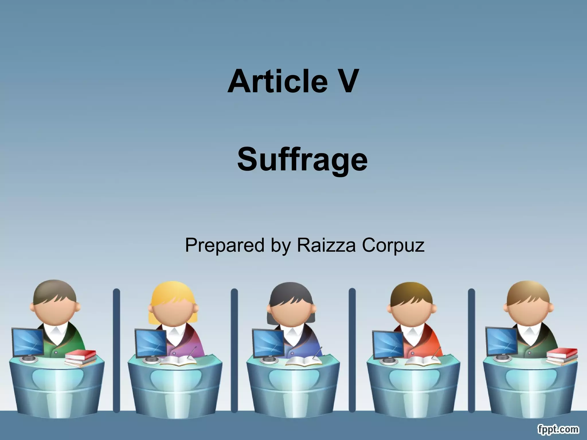 Suffrage refers to the right and obligation to vote for qualified citizens. It is considered both a privilege and a political right that enables citizens to participate in government. The key qualifications to vote in the Philippines include being a citizen at least 18 years of age, having resided in the Philippines for at least one year and in the local area for at least 6 months. Suffrage encompasses elections, plebiscites, referendums, initiatives, and recalls. Registering to vote is required by law. Illiterate and disabled citizens can vote if assisted by a relative or election official. Absentee voting is provided for qualified Filipinos abroad. Certain crimes can disqualify a person from voting for a period of
