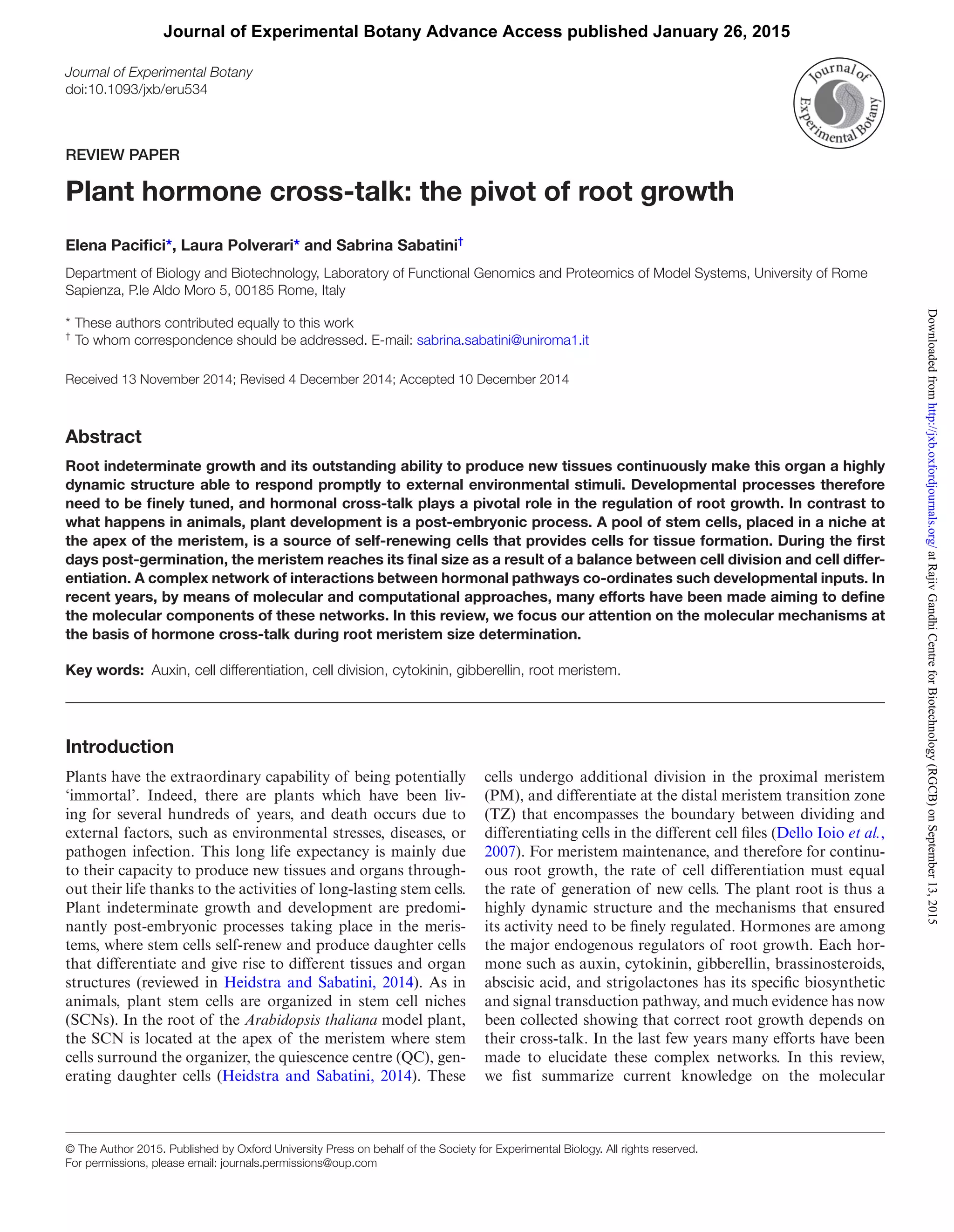 This document summarizes current knowledge about plant hormone cross-talk during root meristem size determination. It discusses the molecular mechanisms of auxin, cytokinin, and gibberellin biosynthesis, transport, and signaling. It explains that a complex network of hormone interactions coordinates root development processes like cell division and differentiation to determine meristem size. Recent research efforts aim to define the components and dynamics of these hormonal networks through molecular and computational approaches.