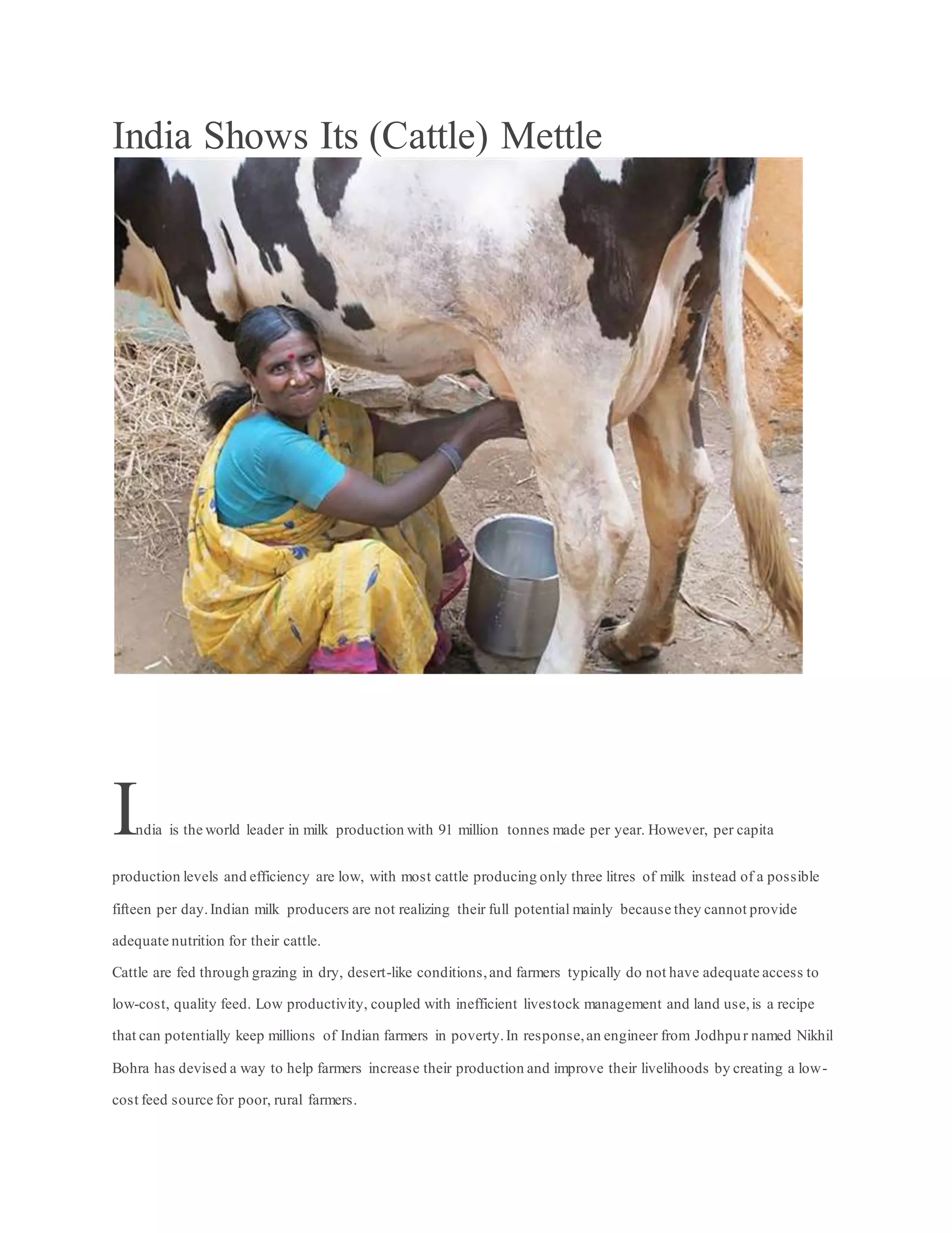 Cattle Mettle is a social enterprise created by Nikhil Bohra that uses an invasive plant called the mesquite tree to provide low-cost, nutritious feed for cattle. This increases milk production and farmer incomes in the dry, desert-like Thar region of India where most cattle currently produce only 3 liters of milk per day instead of the possible 15. Early small trials showed a 20% increase in milk production using Cattle Mettle's mesquite feed. The organization aims to provide affordable daily cattle feed to 200,000 head of cattle and 100,000 households in the Thar Desert within 5 years, creating over 6,000 jobs and stopping the spread of invasive mesquite plants. Ultimately, Cattle