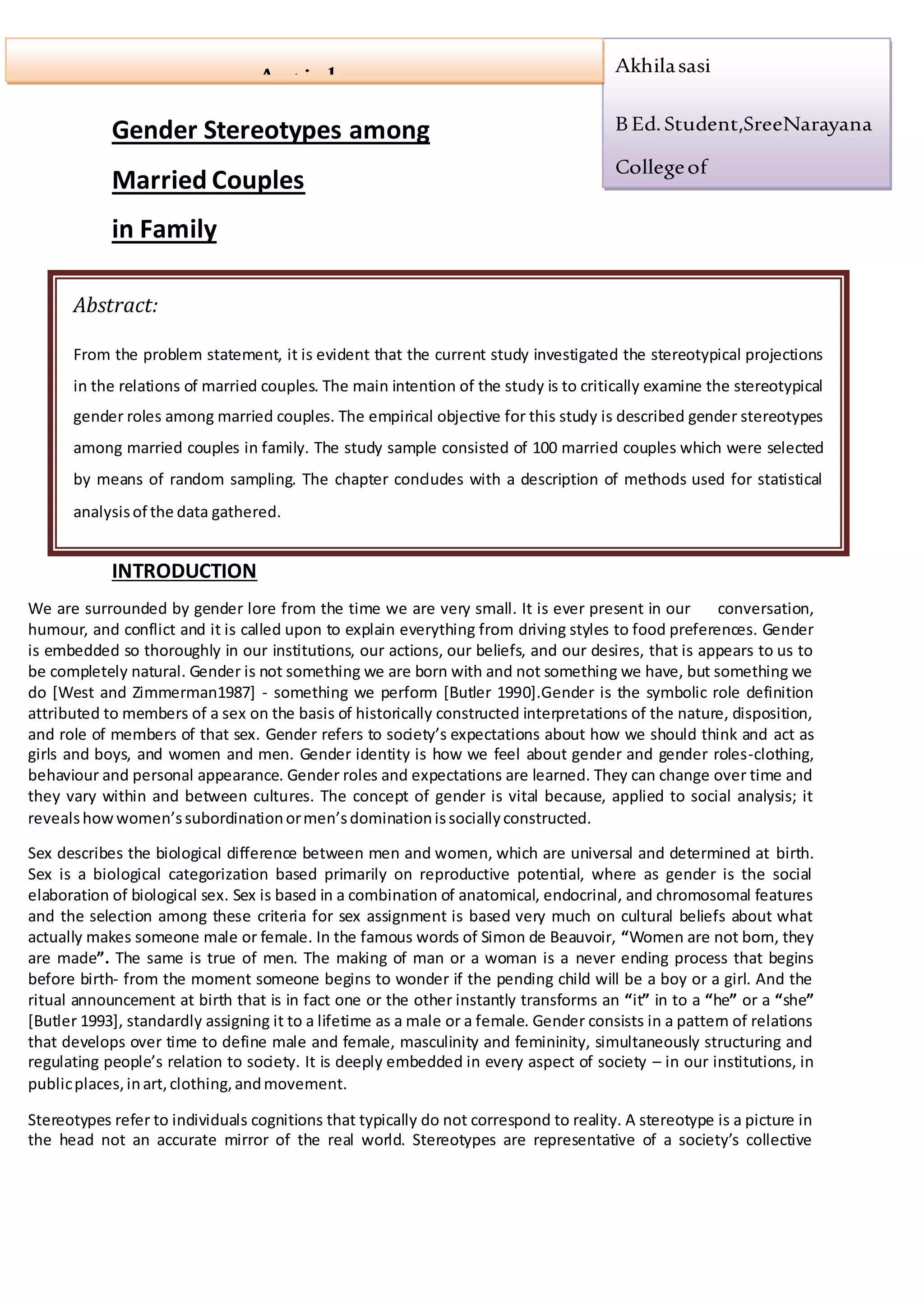 The document discusses gender stereotypes among married couples in family. It aims to critically examine stereotypical gender roles through a study of 100 married couples selected randomly. The study objectives are to identify major areas of gender stereotypes in household responsibilities, decision making, independence, and social life. It analyzes data collected through questionnaires and interviews using statistical techniques to understand stereotypical perceptions between husbands and wives. Preliminary results show disagreements around equal sharing of household work and a tendency to see men as achievers outside home while women take care of family.