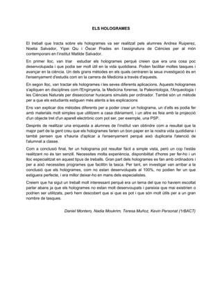 El treballque tracta sobre els hologrames va ser realitzat pels alumnes Andrea Ruiperez,