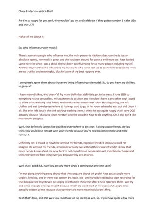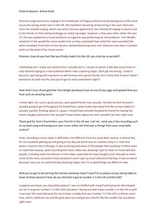 Shannon Leigh went from singing in her hometown of Chicago to becoming one of the most successful young artists in the UK. She started singing at age 8 and did small gigs as a backup singer until she was 17 and spotted by a music producer Tom Wright. Wright asked her to record in a studio, starting her career. Shannon now lives in London at the peak of her career. Her first UK hit "Call Me" went number 1 in both the UK and USA, which she celebrated by getting drunk with friends. Shannon hopes to write her own songs and go on tour in the future.