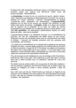 Ara, les polítiques socials destrueixen tot un sistema de protecció social d'un estat de Benestar. Conseqüència d’aquestes polítiques els resultats ens donen dades com: 27% de persones que es troben en exclusió(dels quals el 32% són infants), que el salari dels nous llocs de treball és un 40% més baixos; una taxa de desnonaments que ha arribat als 67000 en tot 2014, entre d’altres.