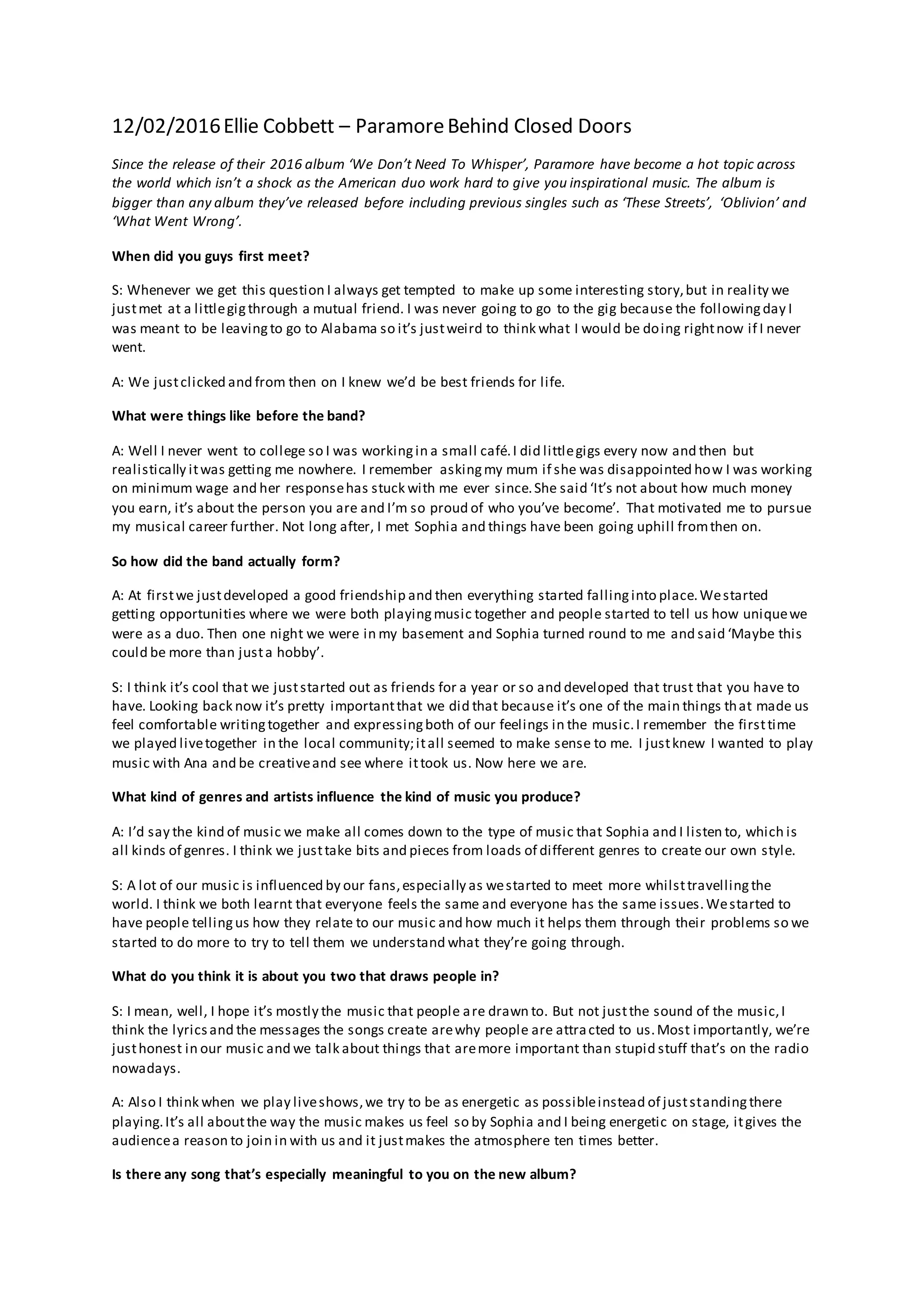 The document is an interview with the American musical duo Paramore discussing the formation of their band and the inspiration and meaning behind their music. Some key points: