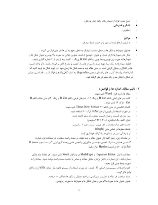 اص دػتاٍسدّا ٍ یافتِ ّاي خظٍّؾ. - تشکر ي قذرداوی اختیاسي. - مراجع تِ تشتیة اسخاع ؿذُ دس هتي ٍ تش حؼة ؿواسُ سدیف. - خذاٍل، ًوَداسّا ٍ ؿىل ّا دس هحل هٌاػة (ًضدیه تِ هحل سخَع تِ آى ّا) دس هتي لشاس هی گیشًذ . ؿىل ّا ٍ ًوَداسّا داساي ؿواسُ ٍ ػٌَاى ( تَضیح ) تاؿٌذ. ػٌاٍیي خذاٍل تِ صَست تاال ًَیغ ٍ ػٌَاى ؿىل ّا ٍ - ًوَداسّا تِ صَست صیش ًَیغ ٍػط چیي ٍ تا للن B Zarخشسًگ 11تایح ٍ تِ تشتیة اص 1 ؿواسُ گزاسي ؿًَذ . خطَط ًوَداسّا تِ سًگ ػیاُ تْیِ ؿًَذ تا خغ اص چاج، اص ویفیت ٍ ٍضَح وافی تشخَسداس تاؿٌذ .روش ٍاحذ وویت ّا دس اؿىال ٍ خذاٍل الضاهی اػت .دس هتي همالِ تایذ تِ ّوِ ؿىل ّا اسخاع ؿَد . دس تْیِ ؿىل ّا تَخِ وٌیذ وِ اًذاصُ اػذاد، ٍاطُ ّا، وویت ّا ٍ ساٌّواي هٌحٌی ّا) (legendتِ اًذاصُ وافی ٍاضح ٍ خَاًا تاؿٌذ . فاصلِ تیي ػٌَاى ّش ؿىل تا ؿىل تؼذي یه ػطش دس ًظش گشفتِ ؿَد. 3- تایپ مقالٍ، اوذازٌ َا ي فًاصل: همالِ ّا تا ًشم افضاس Wordتایح ؿًَذ - ولیِ تیتش ّاي اصلی تا للن B Zarخش سًگ 41 ، تیتشّاي فشػی تا للن B Zarخش سًگ 21ٍ هتي همالِ تا للن B - ً Zarاصن 21 تایح ؿًَذ . ولوات اًگلیؼی دس هتي تا للن 21 Times New Romanتایح ؿًَذ . - دس صَست اػتفادُ اص خاٍسلی، اص للن ً B Zarاصن 11 اػتفادُ ؿَد. - تیي هتي ّش لؼوت ٍ ػٌَاى لؼوت تؼذي، یه ػطش فاصلِ تاؿذ. - اًذاصُ واغز: 4 Aاػتاًذاسد (112 ×792 هیلیوتش). - حاؿیِ ّاي توام صفحات : تاال، خاییي، ساػت ٍ چح 3 ػاًتیوتش. - فاصلِ ػطشّا دس تواهی هتي ).(single - اص تَ سفتگی هتي دس اتتذاي ّش خاساگشاف خَدداسي گشدد. - دس صفحات صٍج، چْاس ولوِ اٍل ػٌَاى همالِ ٍ چٌذ ًمطِ، دس ػوت ساػت صفحِ ٍ دس صفحات فشد، ػثاست - "ؿـویي ّوایؾ هـتشن اًدوي هٌْذػیي هتالَسطي ٍ اًدوي ػلوی سیختِ گشي ایشاى "دس ػوت چح صفحِ( B ً Zarاصن 11) دس لؼوت Headerلشاس دّیذ. هؼادالت تا اتضاس Equation Editorیا MathTypeدس ًشم افضاس Wordتایح ؿًَذ . ّش هؼادلِ تایذ داساي - ؿواسُ تاؿذ . ایي ؿواسُ دس داخل خشاًتض ٍ هماتل هؼادلِ ٍ هواع تا حاؿیِ ػوت ساػت ًَؿتِ ؿَد . هؼادلِ سا تِ صَست ٍػط چیي لشاس دّیذ. ولیِ ٍاحذّا دس ػیؼتن تیي الوللی SIتاؿٌذ . دس صَست اػتفادُ اص ػیؼتن ّاي دیگش، هؼادل ) (SIآى دس داخل - خشاًتض روش گشدد. تؼذاد صفحات ّش همالِ تا احتؼاب هتي اصلی، هشاخغ، خذاٍل ٍ ؿىل ّا حذاوثش 11 صفحِ. - ػٌَاى خذٍل ّا تِ صَست تاالًَیغ ٍ ػٌَاى ؿىل ّا ٍ ًوَداسّا تِ صَست صیشًَیغ. - 2
