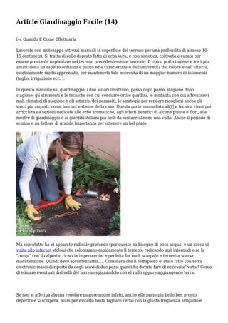 Il documento offre una guida dettagliata su come curare giardini e prati, evidenziando l'importanza della preparazione del terreno, delle pratiche di semina e di manutenzione. Vengono presentati strumenti e tecniche per affrontare le sfide legate al giardinaggio, come i parassiti e le condizioni climatiche. Inoltre, il testo accenna a piante e fiori ideali per realizzare spazi verdi rigogliosi anche in aree limitate.