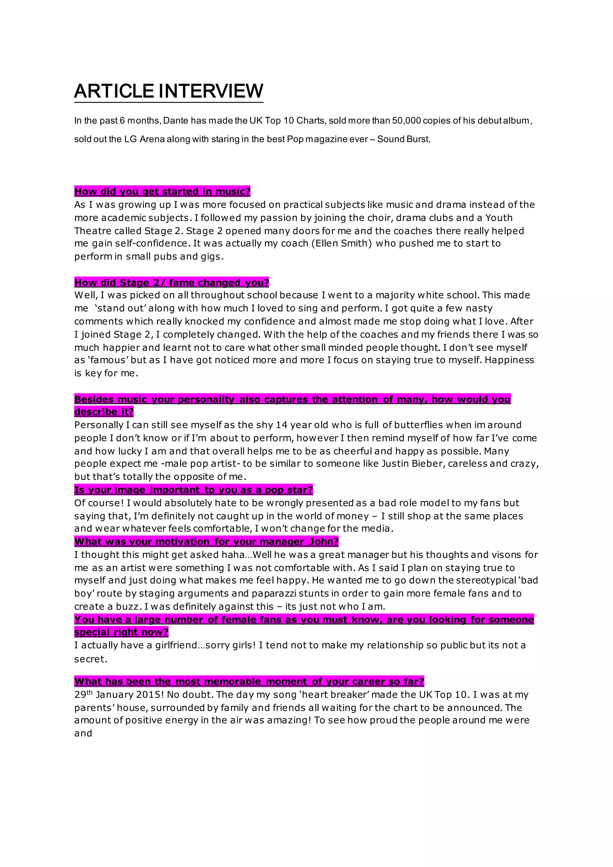 Dante has found success in the UK music charts in the past 6 months with his debut album selling over 50,000 copies. He got his start in music through his passion for subjects like music and drama in school, joining the choir and drama clubs. He was pushed to perform in small pubs and gigs by his coach at Stage 2 Youth Theatre, which helped boost his confidence after facing bullying for his love of singing. While fame has brought more attention, he focuses on staying true to himself and his happiness. He sees himself as shy but is cheerful around others by remembering how far he's come. He wants to avoid being seen as a stereotypical "bad boy" pop star and fired his former manager who wanted