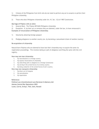 The document summarizes Philippine citizenship laws. It states that citizenship can be acquired through jus solis (birth within the country), jus sanguinis (having a Filipino parent), or naturalization. It also discusses how citizenship is affected by marriage to foreign nationals and how citizenship can be lost or reacquired.