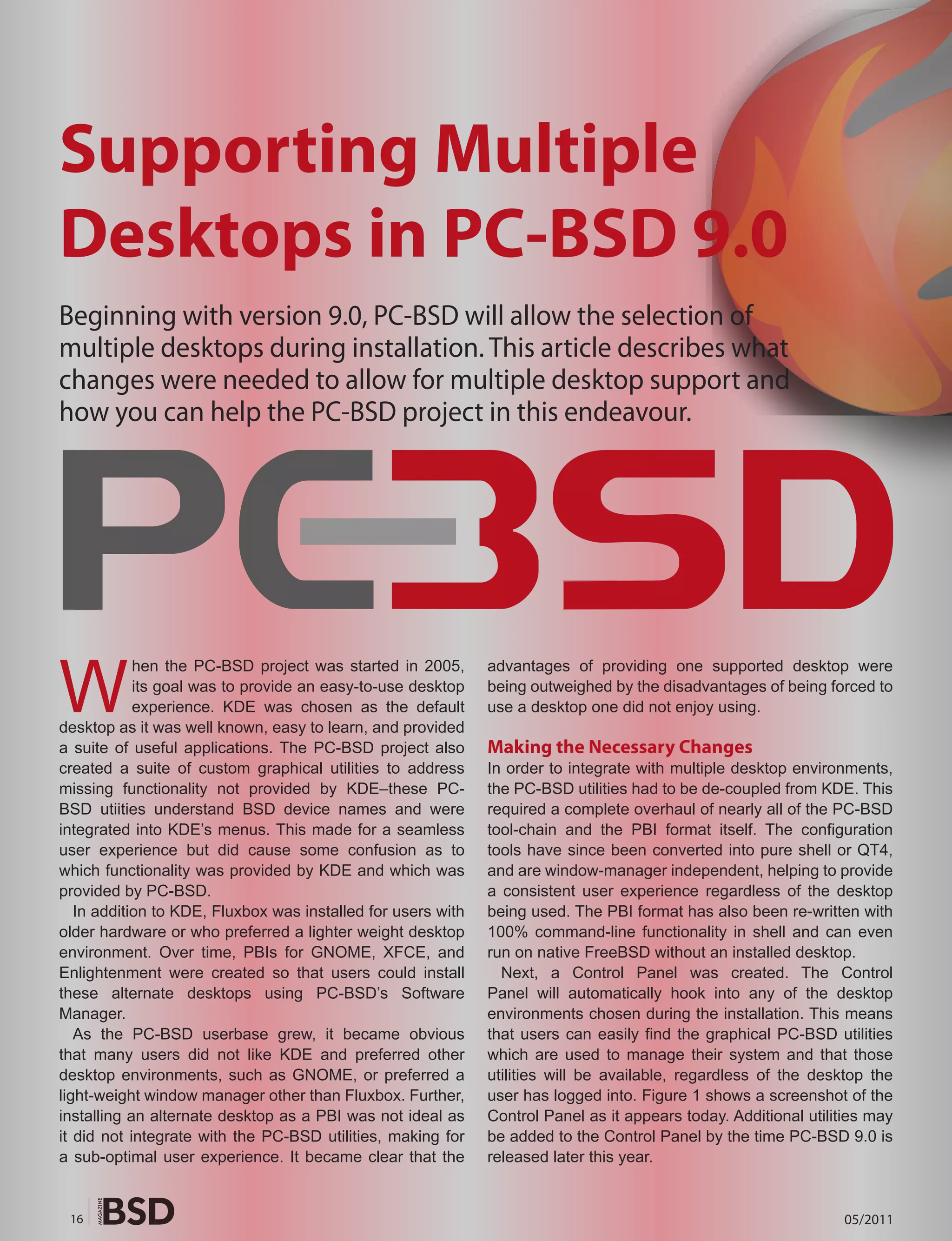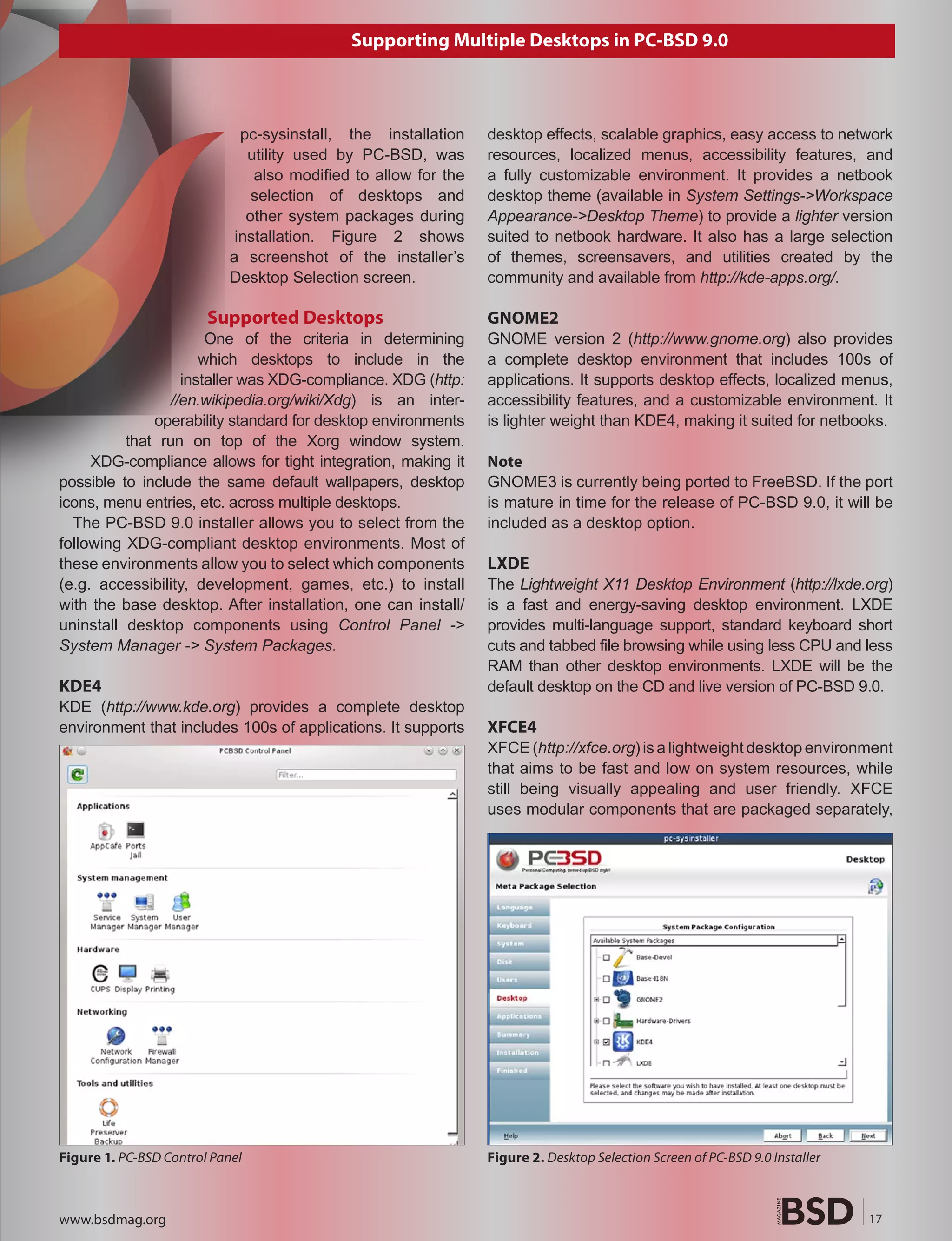 PC-BSD 9.0 will allow users to select multiple desktop environments during installation, such as KDE, GNOME, XFCE, and others. To support multiple desktops, the PC-BSD utilities were decoupled from KDE and reworked to be independent of any particular desktop. A new Control Panel was also created to provide integrated access to PC-BSD utilities from any desktop. Users are encouraged to try the new multiple desktop support in testing snapshots to help identify bugs before the final 9.0 release.