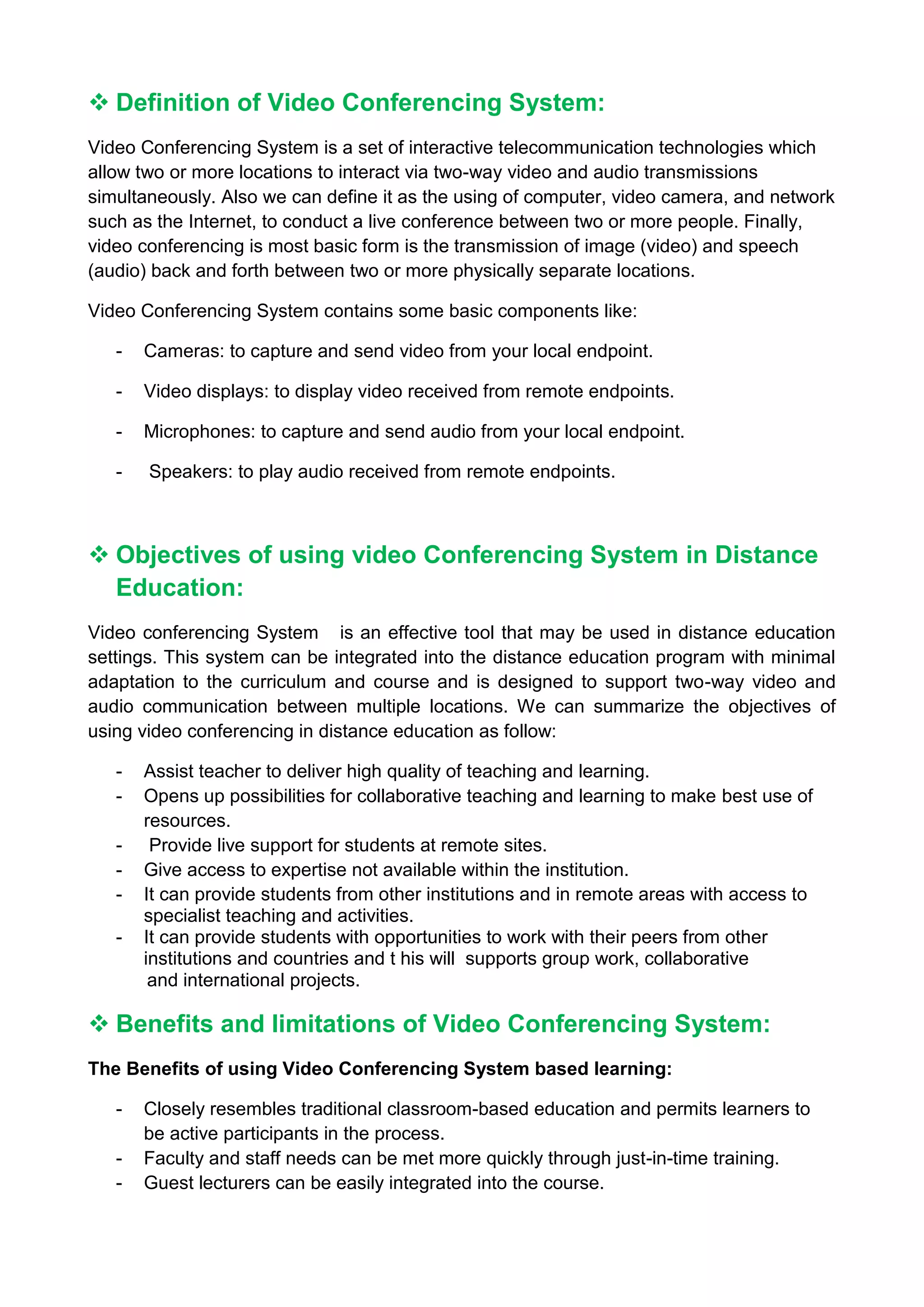 Video conferencing systems allow for real-time audio and video communication between multiple locations. They have several components including cameras, displays, microphones, and speakers. They can be used in distance education to provide high quality teaching, enable collaboration, and give students access to expertise not available locally. Benefits include resembling traditional classes and cost effectiveness. Limitations include high initial costs and equipment requirements, potential student disengagement, and dependence on network infrastructure. Types of systems include desktop conferencing over the internet, ISDN conferencing using digital phone lines, and ATM conferencing over dedicated networks. Research shows people may rely more on superficial cues like likability when communicating via videoconference compared to in-person due to increased cognitive demands