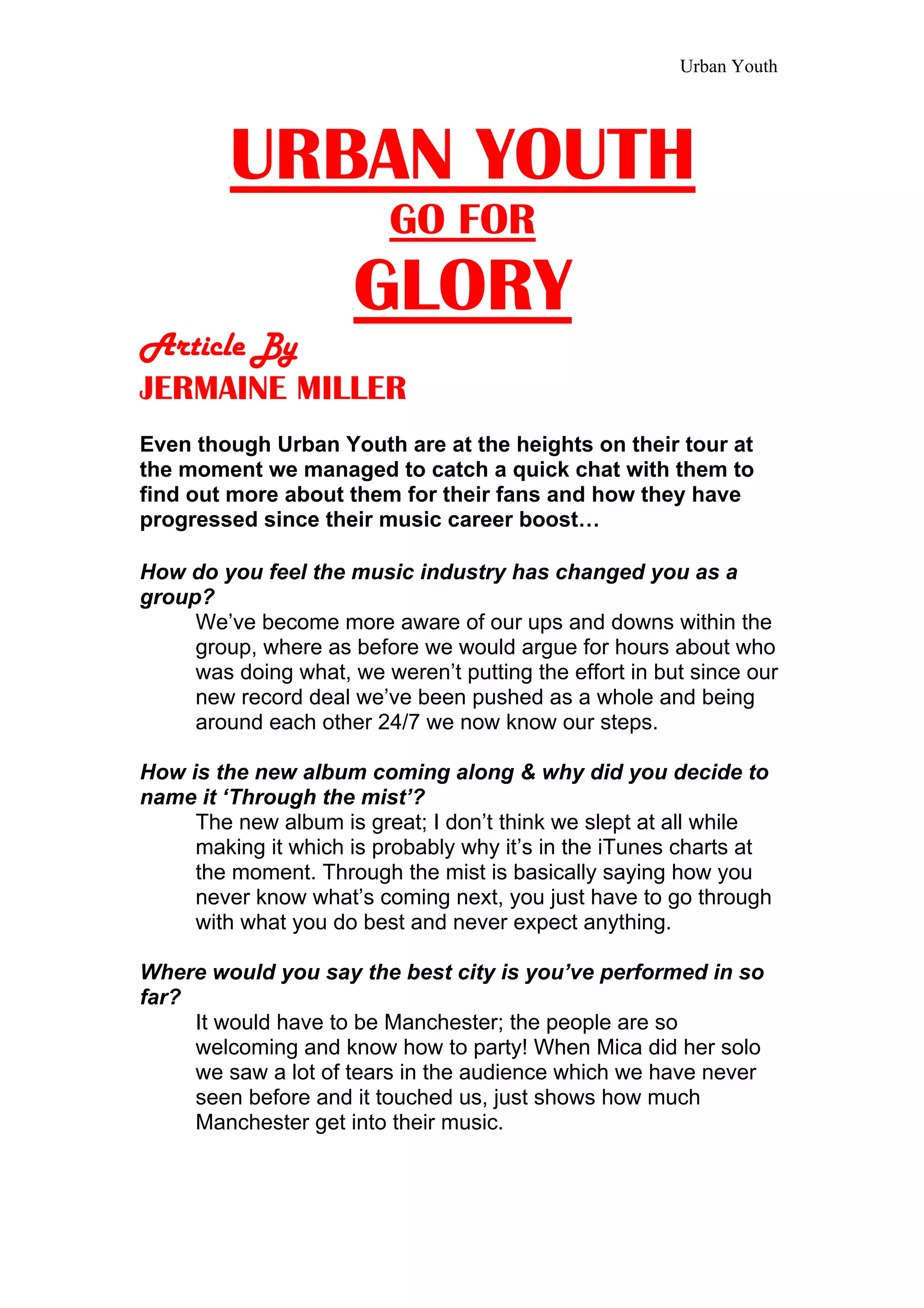 Urban Youth is a music group that has experienced success with their recent record deal and album "Through the Mist". In an interview, the group discusses how the music industry has changed them, the positive reception to their performances in Manchester, influences on their music careers like Jessie J and their families, and teases a future collaboration on their new album with Michael Buble. They also express missing their families on tour but feeling grateful for the opportunities their music has provided.