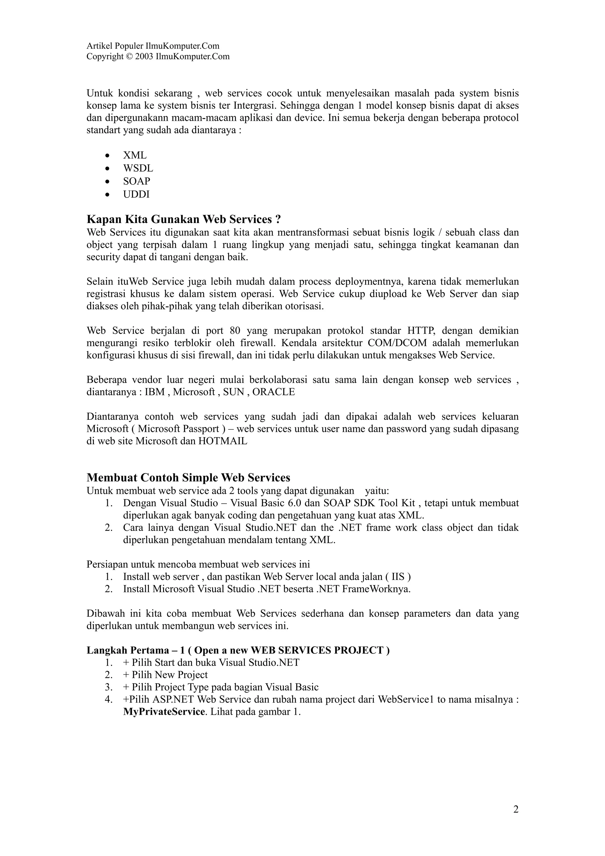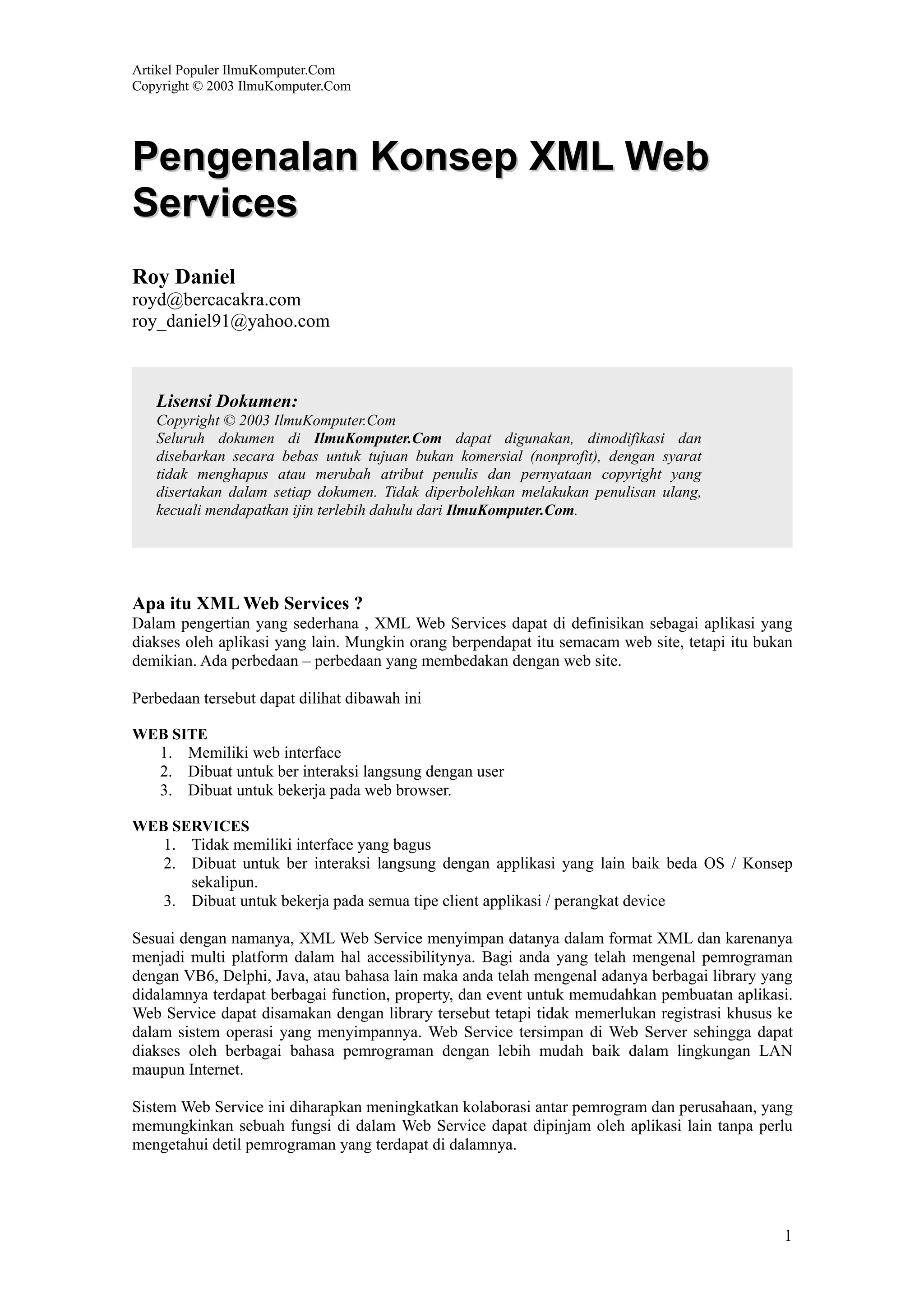 Dokumen ini menjelaskan tentang XML web services yang berfungsi sebagai aplikasi yang dapat diakses antaraplikasi lain. Web services memudahkan kolaborasi antar sistem dan mampu beroperasi di berbagai platform dengan menggunakan berbagai protokol standar. Selain itu, dokumen juga memberikan langkah-langkah pembuatan web services sederhana menggunakan Visual Studio .NET.
