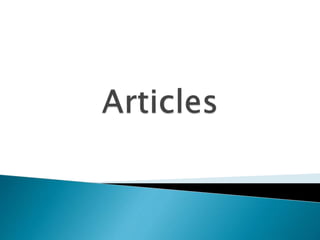 There are two types of articles: definite and indefinite. The definite article is "the" and is used to refer to specific or particular nouns. The indefinite article "a" or "an" refers to nonspecific or general nouns and is not used with plural nouns, uncountable nouns, or material and abstract nouns. Examples are provided for the different uses of definite and indefinite articles.