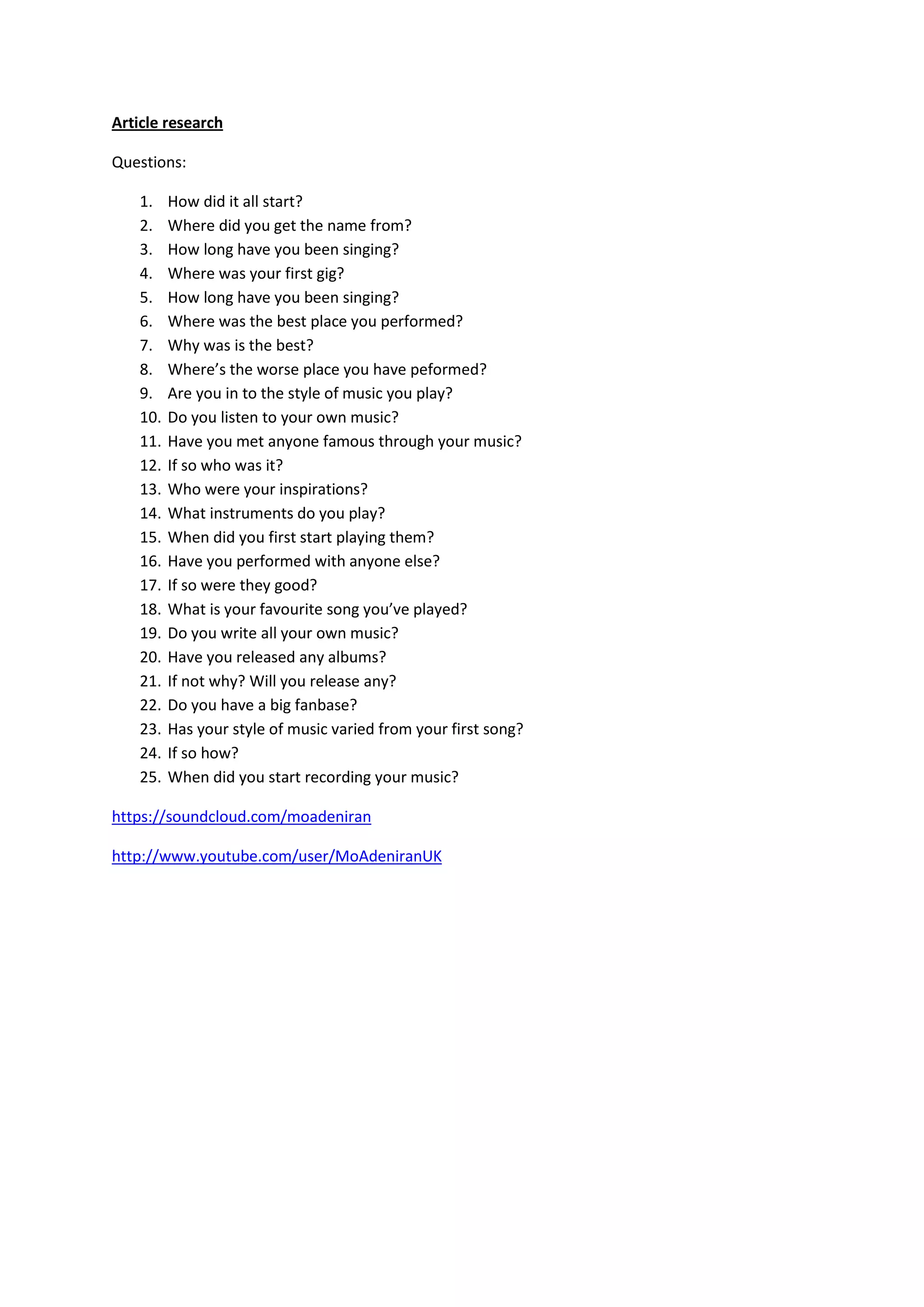 This document contains 25 questions about an artist's music career. It asks about how they got started in music, past performances at different venues, musical influences, the instruments they play, songwriting process, albums, fanbase, and evolution of their musical style over time. Contact information is provided at the end for the artist's SoundCloud and YouTube pages.