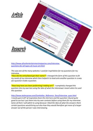 The document discusses sources the author used to develop interview questions for a music-related interview. It provides several websites that inspired questions about how bands get their names, how long they've been performing, and tips for asking good interview questions. It also discusses developing personal questions about how bands met and overcoming stage fright. The author felt they got good inspiration from past media but also wanted questions specific to the interview subject. The document ends by discussing the author's plans for their double-page project spread.