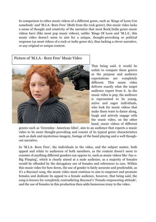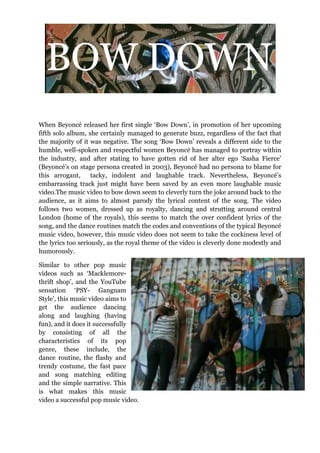 Beyoncé's song "Bow Down" received negative feedback for portraying a different, more arrogant side of her persona. The music video for "Bow Down" seems to parody the song's overconfident lyrics by depicting Beyoncé and another woman dressed as royalty dancing humorously around London. Though lacking in narrative complexity compared to rock music videos, it successfully delivers what pop audiences want - a danceable video that makes them laugh and engage with the music.