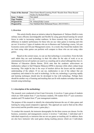 1. The document summarizes three recent studies on the effectiveness of game-based learning. The studies found that students who used video games as a learning aid performed better on tests compared to students who did not use games.