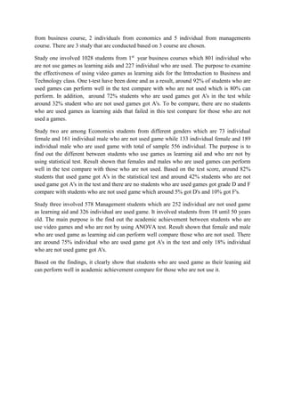 2. The studies involved over 2,000 students across business, economics, and management courses. Students who used games scored higher and had higher rates of A's compared to students who did not use games.